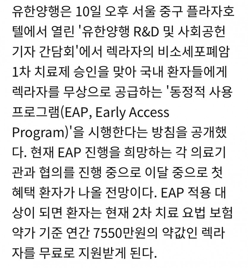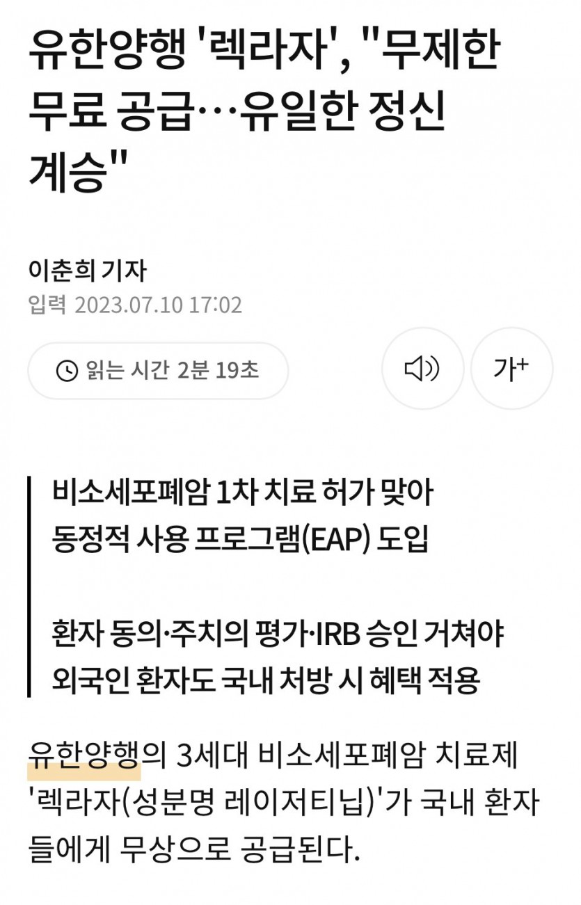 유한양행 폐암 치료제 무제한 무료...