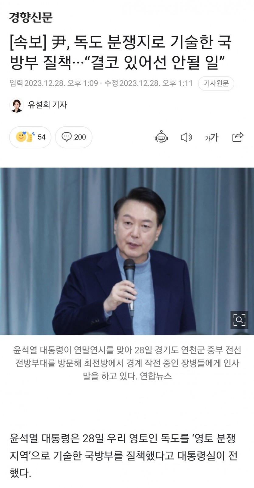 [속보] 尹, 독도 분쟁지로 기술한 국방부 질책···“결코 있어선 안될 일”
