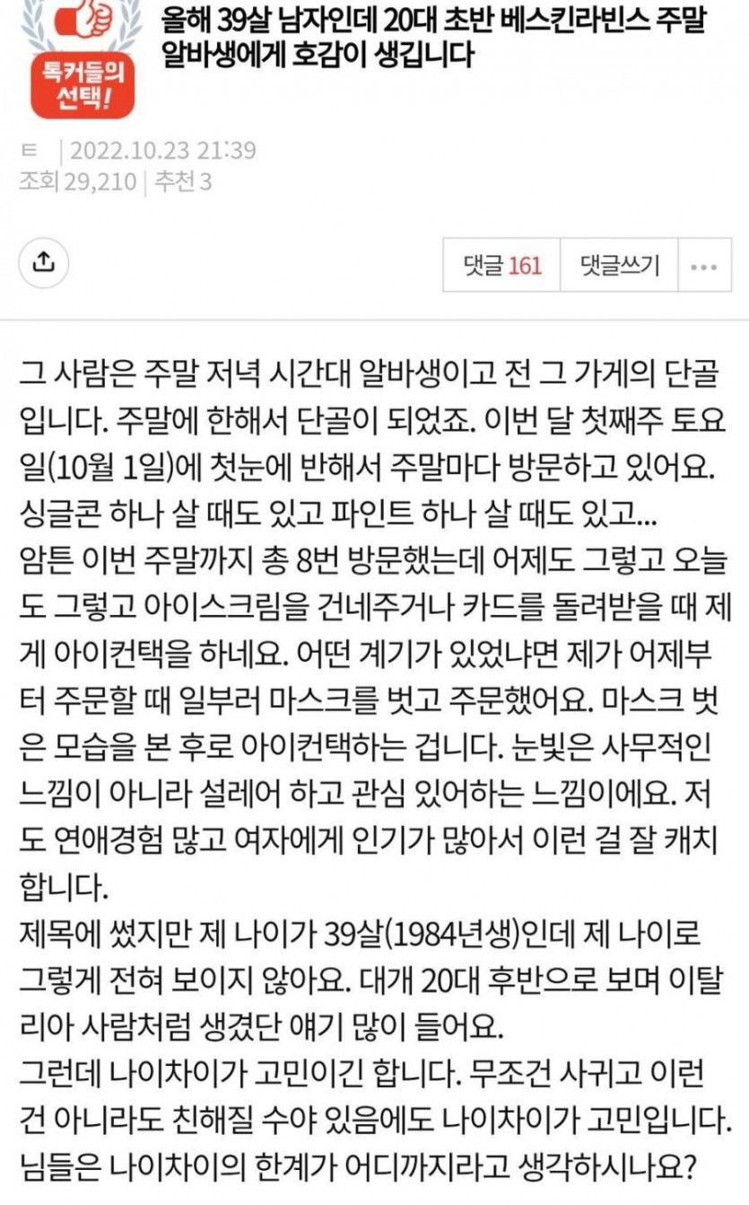 올해 39살 남자인데 20 초반 알바생에게 호상이 생긴다는 남자..