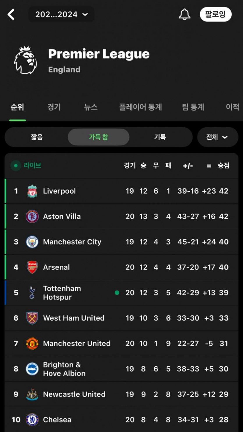 [해외축구] [오피셜] 실시간 PL 순위