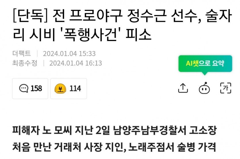 [단독] 정수근 술먹고 사람머리 술병으로 내려쳐