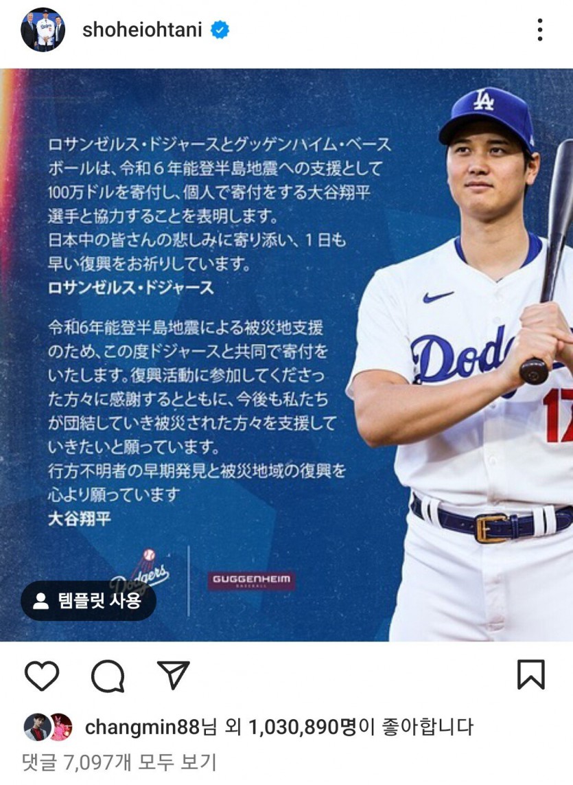 오타니 쇼헤이, 이시카와현 대지진에 13억원 기부.jpg