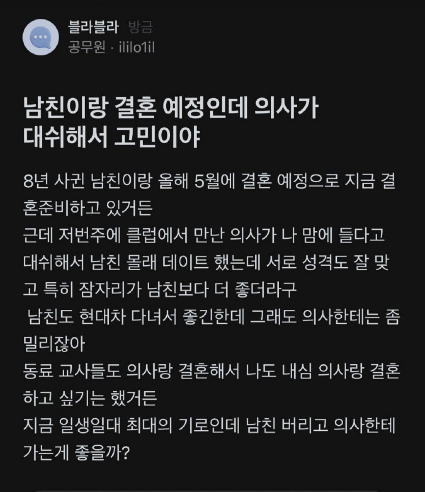 남친이랑 경혼예정인 여자..의사남자가 대쉬했다고 고민임.