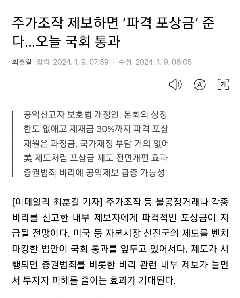 주가조작 제보하면 파격 포상금 준다 오늘 국회통과.