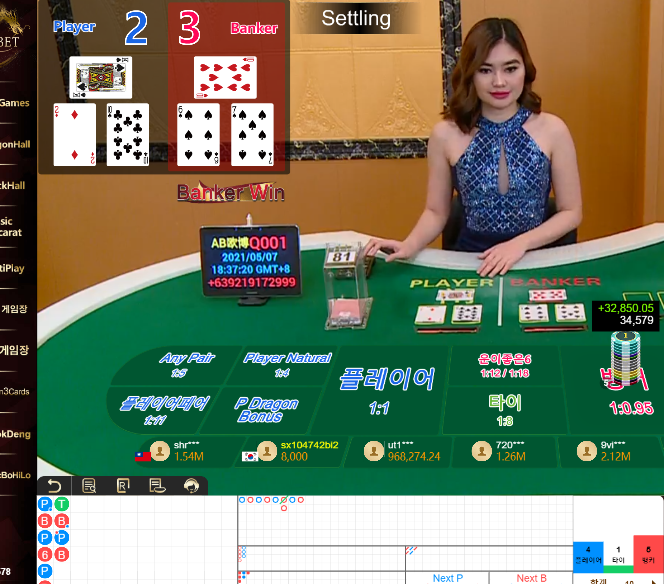 바카라 한끗차이로 아슬하게 뱅커 먹어네요