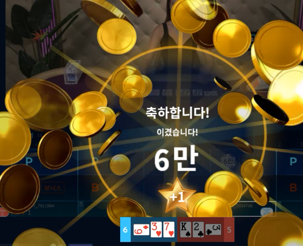 플레이어 6으로 뱅커 5한테 한끗차로 승