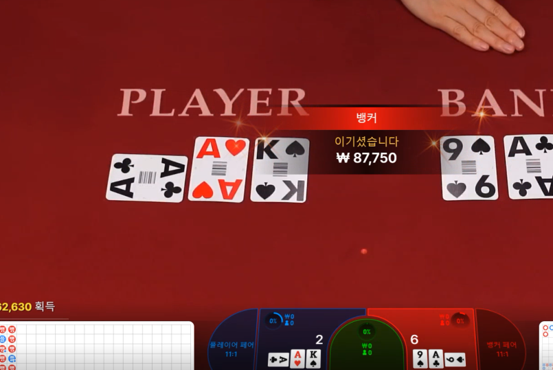 뱅커 카드 2장으로 승부 안나서 3장 승부에서 뱅커가 이겨서 저도 먹어요 ㅎ