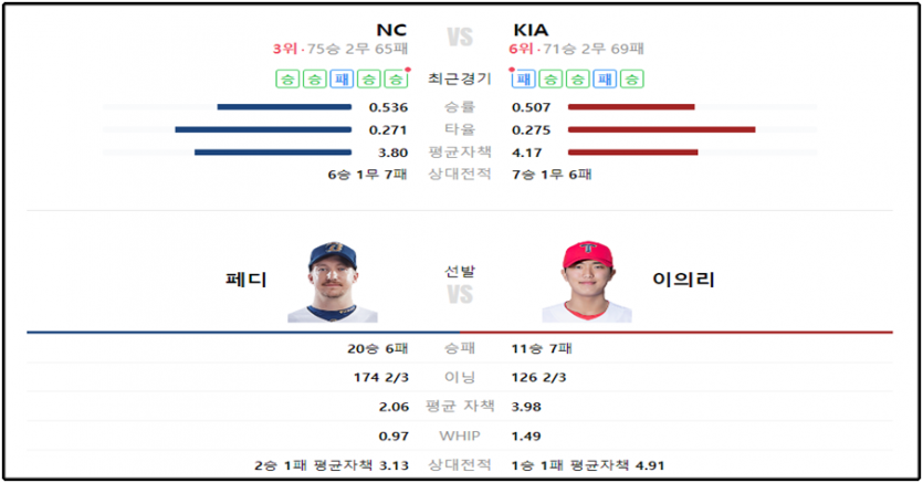 기아는 직전 두산전에서 선발 김건국이 2.2이닝 3실점으로 고전하고 말았고 이후 등판한 불펜들이 잘 막아주긴 헀지만 타선에서 3안타 1득점으로 고전하면서 1-3 패배를 기록했다.NC는 직전 삼성과의 경기에서 선발 송명기가 2.2이닝 2실점으로 고전하긴 했지만 이후 불펜들이 잘 버텨냈고 타선에서도 13개의 안타를 때려내면서 5-3 승리를 기록했다.그리고 오늘부터 두팀간 2연전이 펼쳐지게 되는데 승리는 기아가 기록할 것으로 예상된다. 물론 NC페디가 올시즌 리그에서 가장 좋은 흐름을 만들어내고 있긴 하다. 또한 NC는 3위확정을 위해 모든 힘을 쏟을 예정! 다만 오늘 선발 페디가 조금이라도 흔들리게 되면 PS준비 차원에서 조기에 마운드에서 내릴 가능성은 열어둬야 한다.기아 선발 이의리도 구위강점을 잘 보여주고 있고 또 이번 2연전이 홈 최종전이기 때문에 기아도 전력을 쏟을 예정이긴 하다.최근 두팀의 불펜 경쟁력을 봤을 때 기아가 더 안정적인 모습을 보여주고 있고 기아타선이 폭발력을 보여주고 있지는 못하긴 하지만 최근 홈에서치른 5경기에서 최소 8안타는 기록했었다는 점을 감안해본다면 오늘 기아의 승리를 노려봐도 좋겠다.
