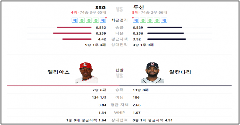 두산은 직전 LG전에서 선발 김동주가 3.2이닝 4실점으로 부진하며 선발 경쟁에서 밀리고 말았고 결국 2-5 패배를 기록했다.SSG는 직전 삼성과의 경기에서 5회까지 한점 리드를 잡았지만 선발 문승원이 6회 흔들리고 말았고 결국 3-5 패배를 기록했다.그리고 오늘부터 두팀간 2연전(1차전 잠실, 2차전 문학)이 펼쳐지게 되는데 첫 경기 승리는 SSG가 기록할 것으로 예상된다.SSG선발 엘리아스는 직전경기 고전하긴 했지만 앞선 경기들에서 QS행진을 이어갔었고 올시즌 두산전 성적도 좋아 기대치가 높다.반면 두산선발 알칸타라는 9월 마지막 등판이였던 NC전 타구에 손을 맞은 이후 2경기 연속 고전 중인 상황! 또한 SSG전 한차례 무너진적도 있었으니 오늘 선발 경쟁에서는 SSG가 우위를 점할 수 있을 것으로 예상된다.두팀모두 동기부여가 상당한만큼 오늘 불펜운영도 상당히 적극적일것으로 보이는데 SSG불펜은 최근 8경기에서 1실점을 넘기고 있지 않은반면 두산불펜은 최근 8경기 평균 2.5실점을 기록하고 있는 상황!SSG타선에 최정이 빠져있긴 하지만 최주환, 한유섬, 에레디아, 하재훈 등 장타능력이 뛰어난 자원들이 많고 박성한, 최지훈 등 빠른발을 앞세워 작전수행능력이 뛰어난 자원들도 있기 때문에 오늘 경기 승리는 SSG가 기록할 것으로 예상된다.