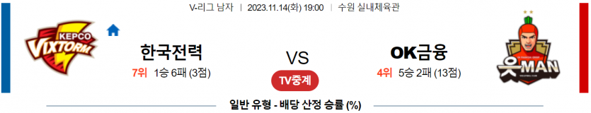 11월 14일 19:00 V-리그 남자 한국전력 : OK금융그룹 국내배구분석